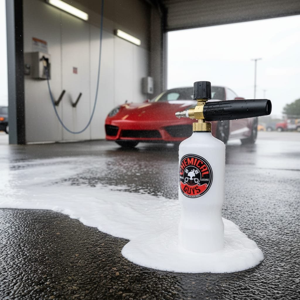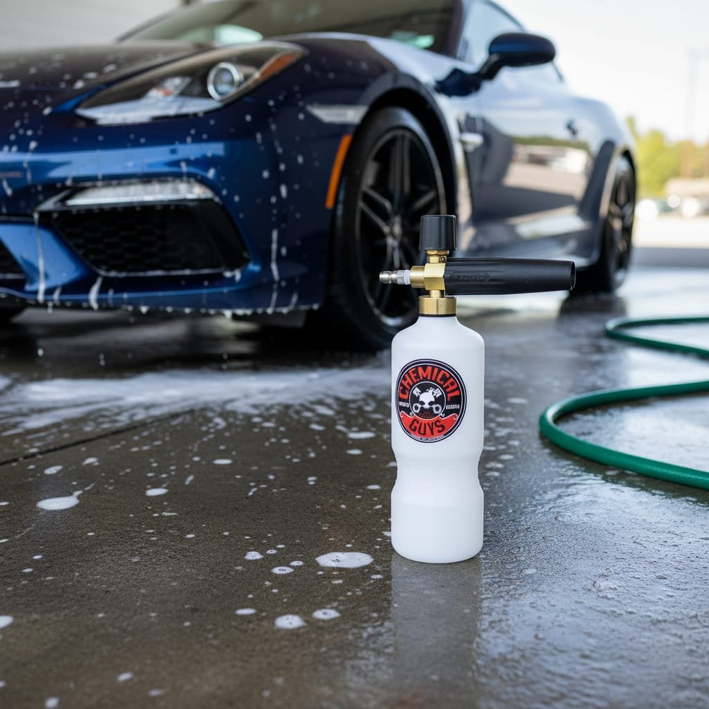 Lanza espuma de la marca chemical guys para hidrolavadoras con cople rapido de 1/4 + regalo shampoo chemical guys de 473 mililitros con toalla chemical guys 40 cm x 40 cm